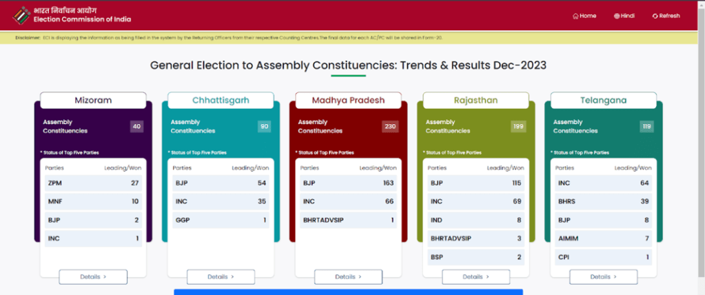 ECI Results website: The prompt dissemination of round-wise information is crucial for ensuring a reliable data source. Counting data entered by Returning Officers is accessible to the public via the ‘Trends and Results’ section on the ECI Results website (https://results.eci.gov.in/). The website has been enhanced with features such as map views for improved user experience, and results are presented using infographics. Trends TV displays results with auto-scroll panels in public spaces, while the VHA mobile app also provides access to trends and results.