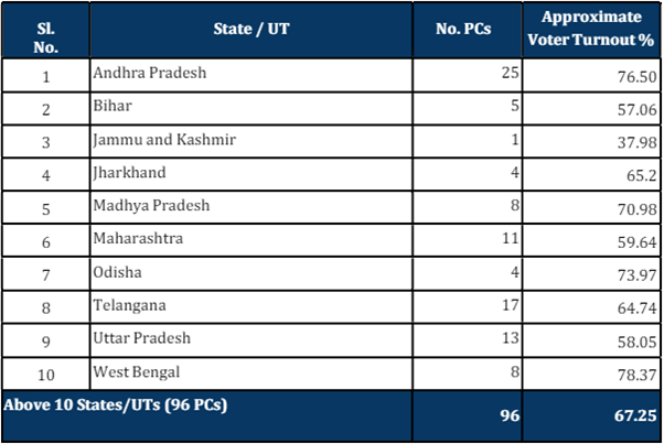 May 13, 2024, marked the 4th phase of the 2024 General Elections. It spanned across 10 States and Union Territories (UTs), with 96 Lok Sabha seats in contention. A total of 1,717 candidates were in the fray in this phase. A total percentage of 69.16% (Updated) turnout was recorded at the end of this phase, which was the highest among the four phases.1 The aggregate turnout in the 95 constituencies (excluding Srinagar) that voted in the fourth phase was 69.5%, the same as in 2019.